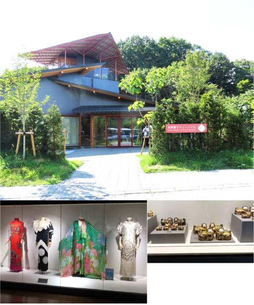 館内には、徹子が様々な場面で着用した華やかな着物やドレスをはじめ、彼女が世界各地から集めた版画や油絵、陶磁器、バッグや器、犬筥、小物など、多種多様な品々が並ぶ。ショップも。ミュージアムの設計は、渋谷の再開発など数々の著名な建築を手がけた内藤廣氏。高度な木造建築の技法が駆使され、軽井沢という土地の特性を生かした気持ちいい建物だ。