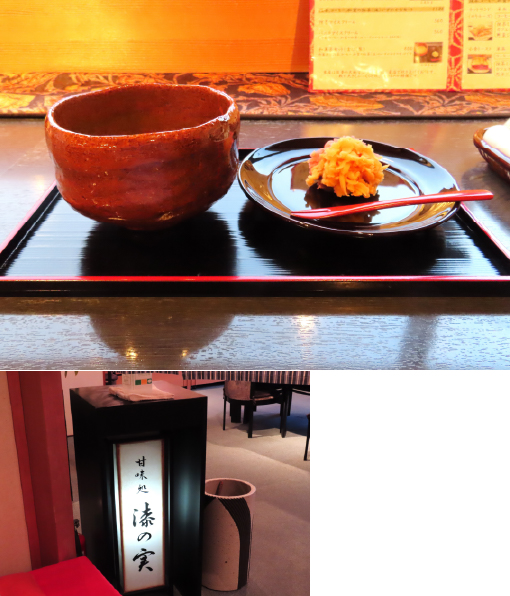 「香林坊」に近い漆器店「能作」4階の甘味店「漆の実」で、お茶を。和菓子は「錦秋」。眼下には「兼六園」まで見渡せる。夕方だったせいか、紅葉した並木には烏が一斉に集まって。1階の漆器店には欲しいものばかり、でも高価。自分のための小さな箸置きを買ってきた。 TEL:076-263-8121